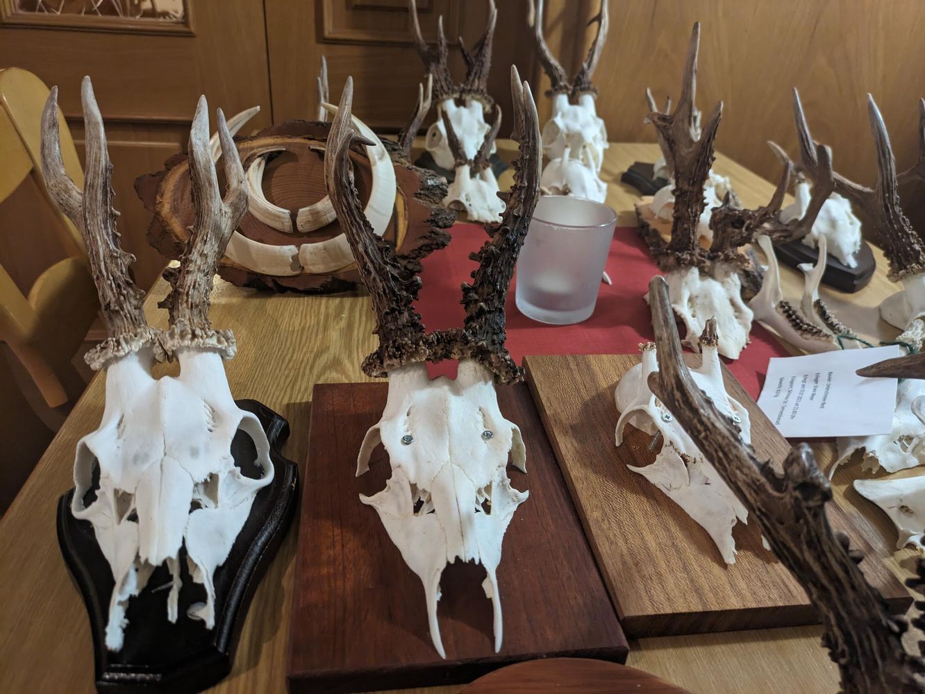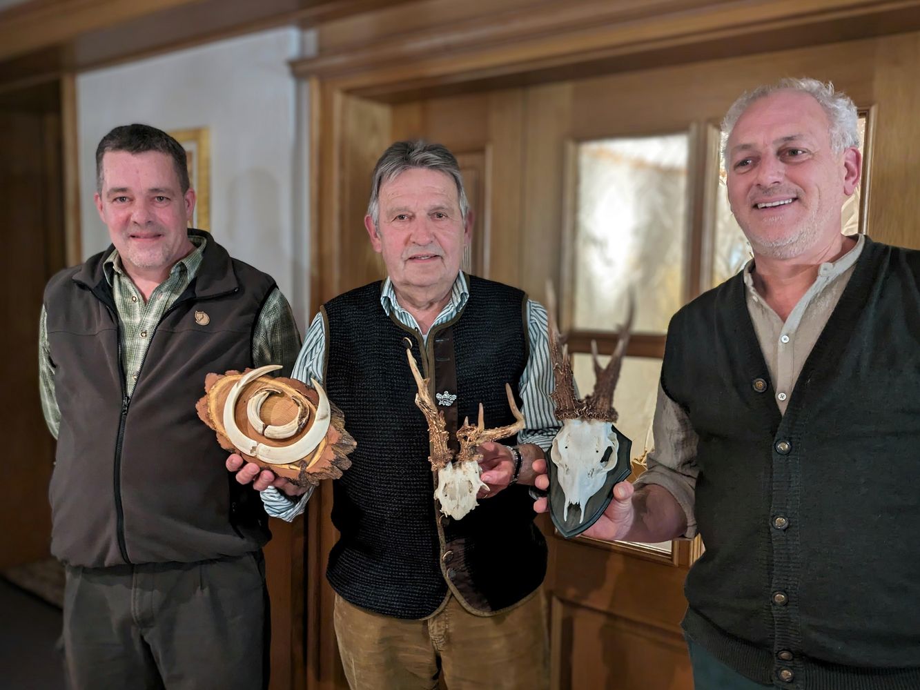 Bei der Trophäenschau wurden die starken Keilerwaffen von Bruno Dreher, das abnormste Gehörn von Johannes Beck und die stärkste Trophäe von Frank Gastel mit einem Preis bedacht.
