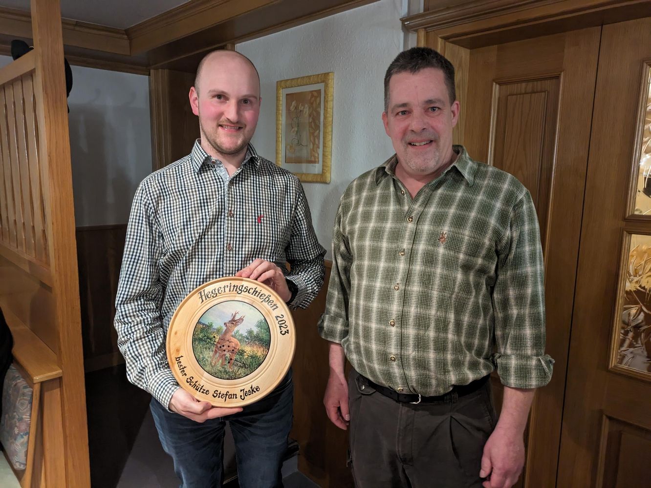 Es folgten die Ehrungen vom Hegeringschiessen 2023 in Herbertingen. Bester Schütze war Alois Schmidt (Kreismeister 2012 und 2019), gefolgt von Stephan Haudek und HRL Alexander Kopp. Der beste Schuss auf die Ehrenscheibe gelang Stefan Jeske aus Inzigkofen.